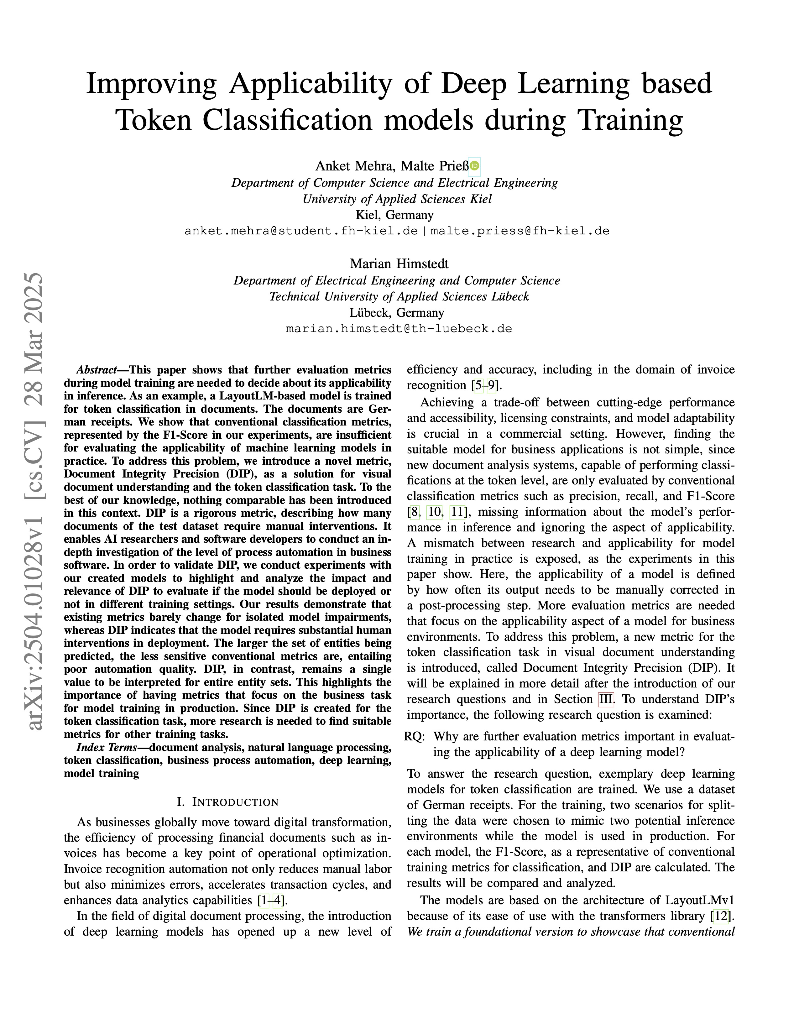 This project focuses on improving the practical applicability of deep learning models for automated invoice recognition. Using LayoutLM-based models for token classification on German receipts, the project addresses a critical gap in model evaluation during training.